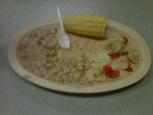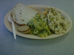 Actually the squash in the salad gave it some taste and moisture for my disabled saliviary glands (sigh) so I was a bit grateful there. I’m giving this meal a D+. For floor show entertainment we had some loon rambling in full voice whether anyone tossed a word his way or not. A few did out of courtesy try to engage him, but their words merely fell into the cacaphony of his blather…while children nearby watched the madman. Nope, although I got some small taste from the food, the floor show was a D+ at best.