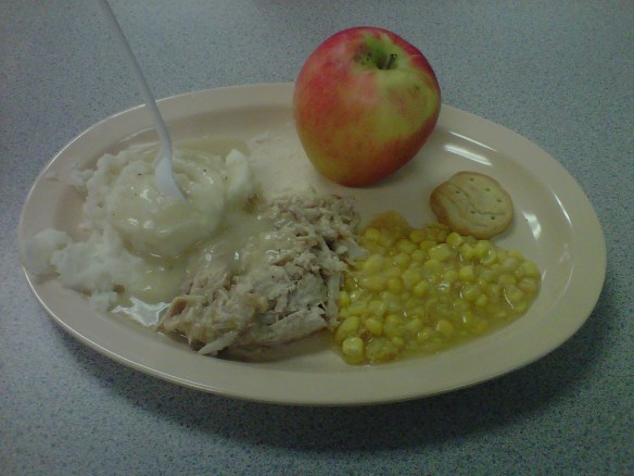 Boise Rescue Mission Cuisine over the past two week period showed only one cookie. But, to their credit, I do recall there was a sampler cup of Chobani Greek yogurt as a cold treat…in lieu of the ultra rare appearance of ice cream. (Oh, darn, there I’ve said it and jinxed it!) Lots and lots of turkey for all us turkeys as you can plainly see…so gobble-gobble for us there! But, all-in-all, the serving sizes did seem better. I’ll give this sampling a C- for their lack of our friend, the Cookie.